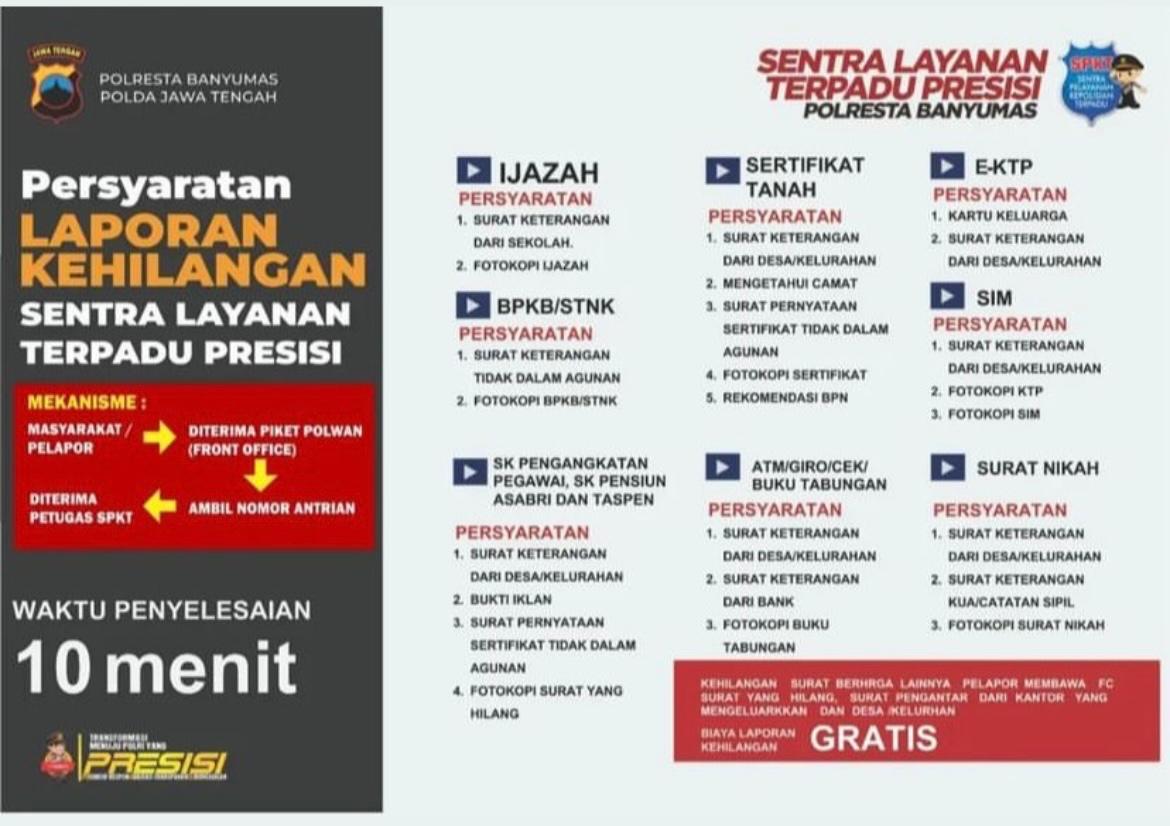 Prosedur Pelayanan Laporan Kehilangan SPKT Polresta BanyumasBerikut merupakan persyaratan yang harus