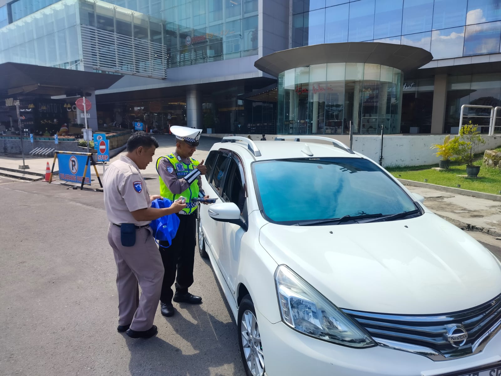 Personil Pospam Terpadu Alun alun Purwokerto OLC 2024 melaksanakan kegiatan himbauan keselamatan ber