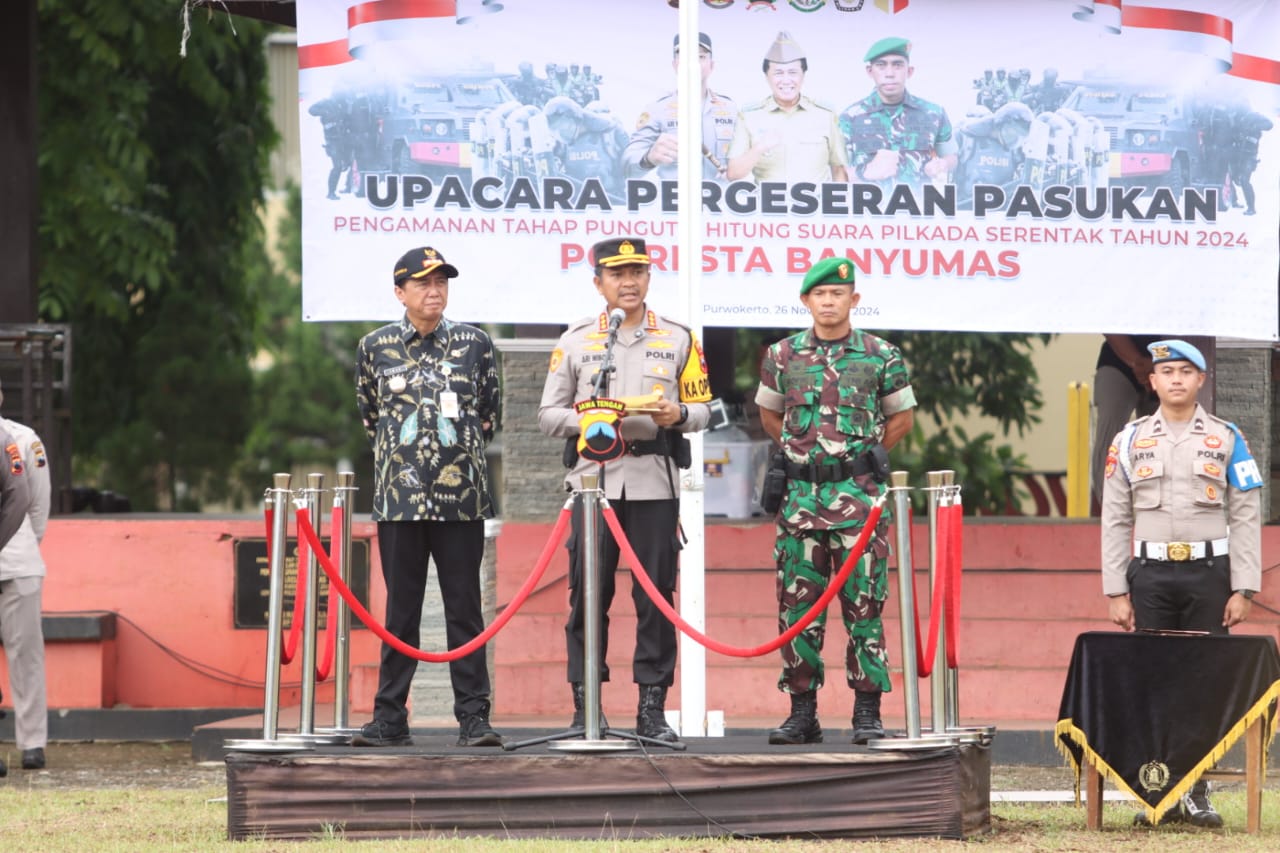 Polresta Banyumas melaksanakan kegiatan Upacara Pergeseran Pasukan Pengamanan Tahap Pungut Suara Pil
