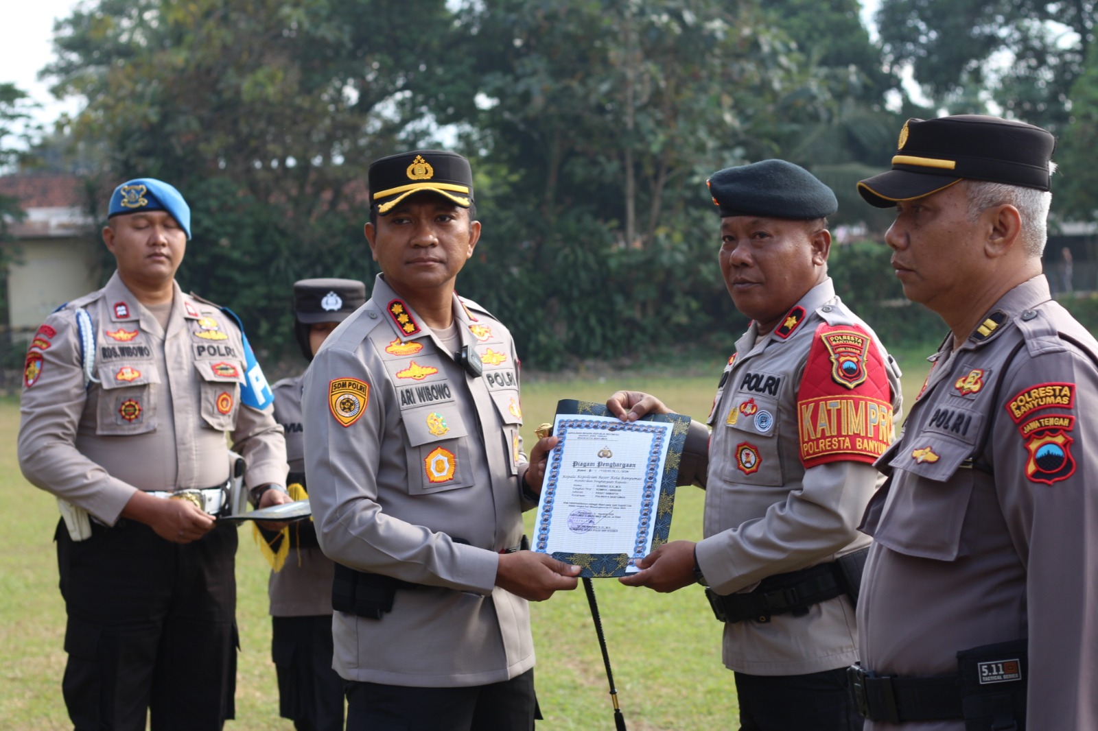 Kapolresta Banyumas Kombes Pol Dr. Ari Wibowo, S.I.K., M.H berikan penghargaan kepada personil Pol